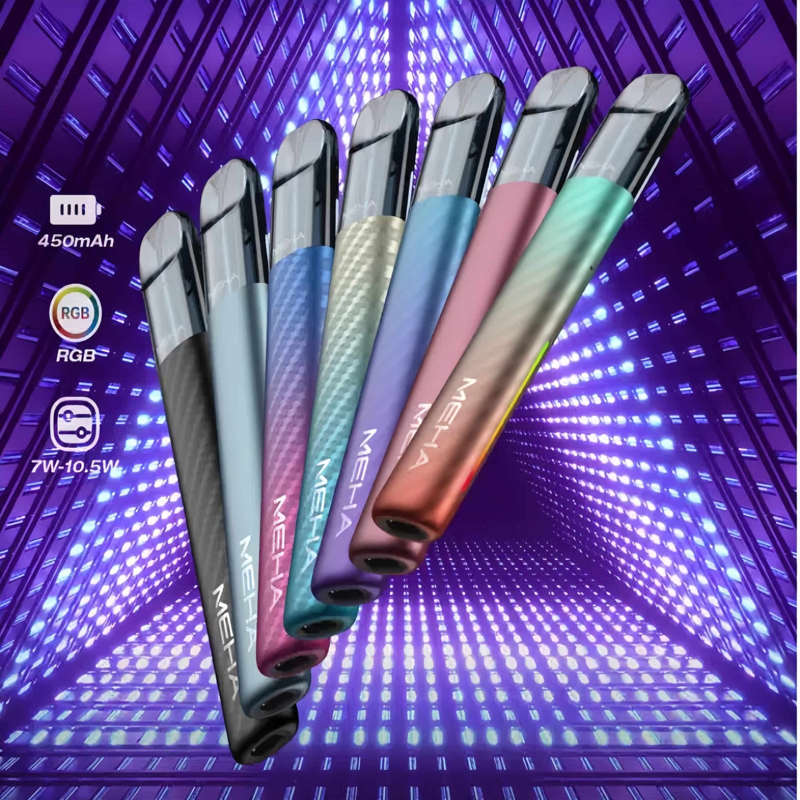 MEHA五代電子菸主機,搭載450mAh電池、三檔功率調整(7W/8.5W/10.5W)、炫彩氛圍燈、童鎖保護、電量顯示及馬達震動,完美兼容五代電子煙煙彈