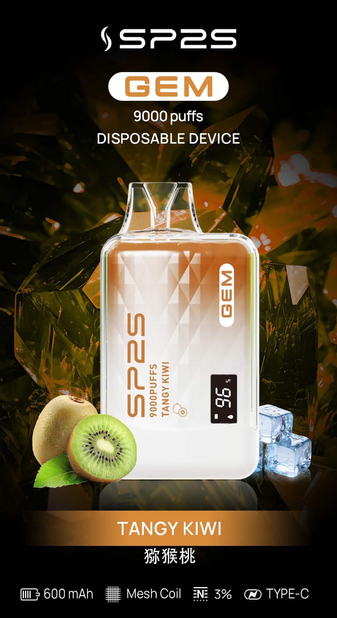 SP2S GEM 9000口拋棄式電子煙以智能顯示與奢華水晶設計,結合Mesh Coil技術與10種口味,打造極致吸煙體驗